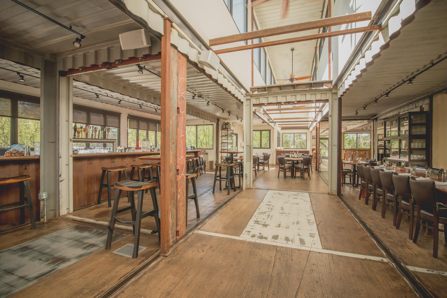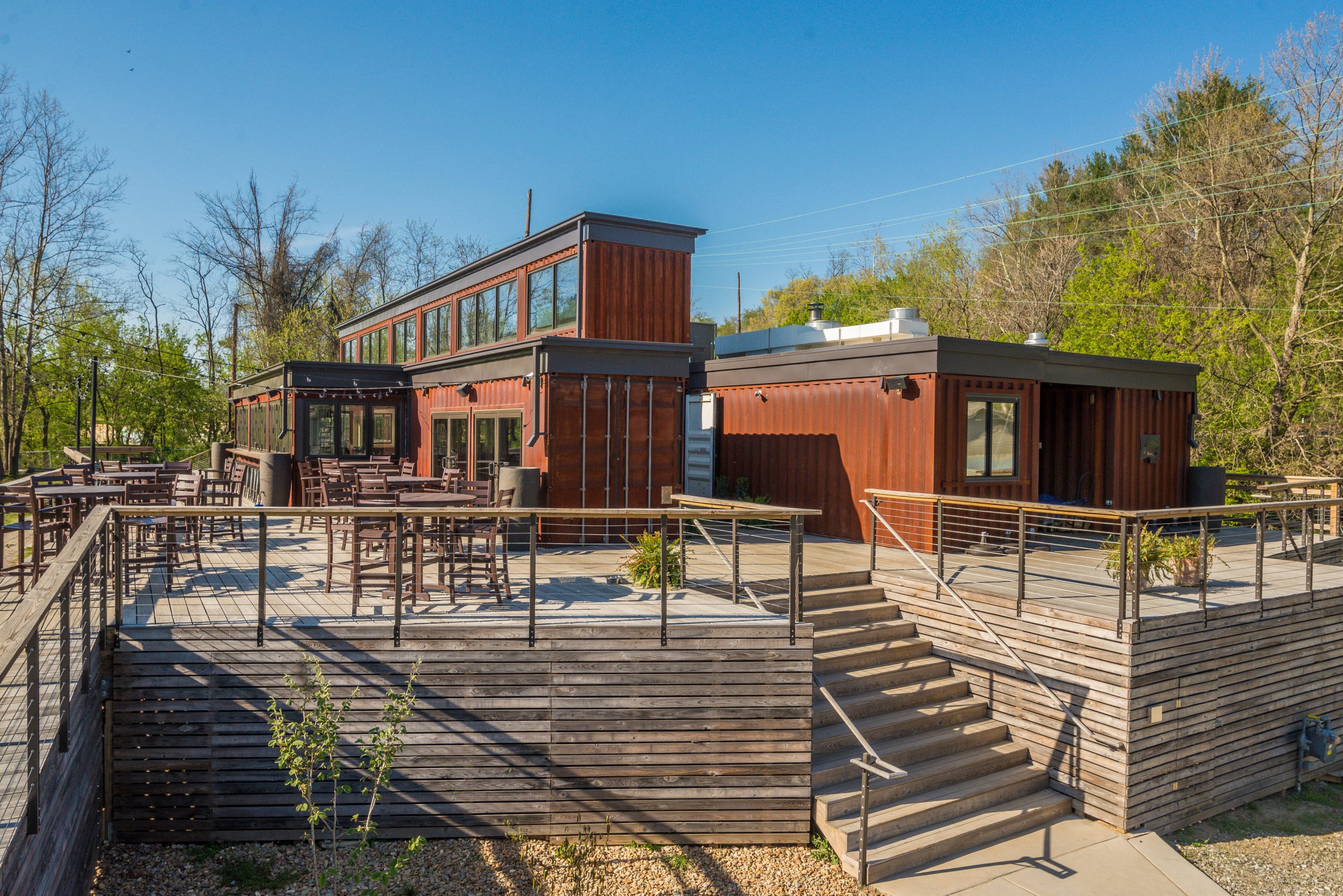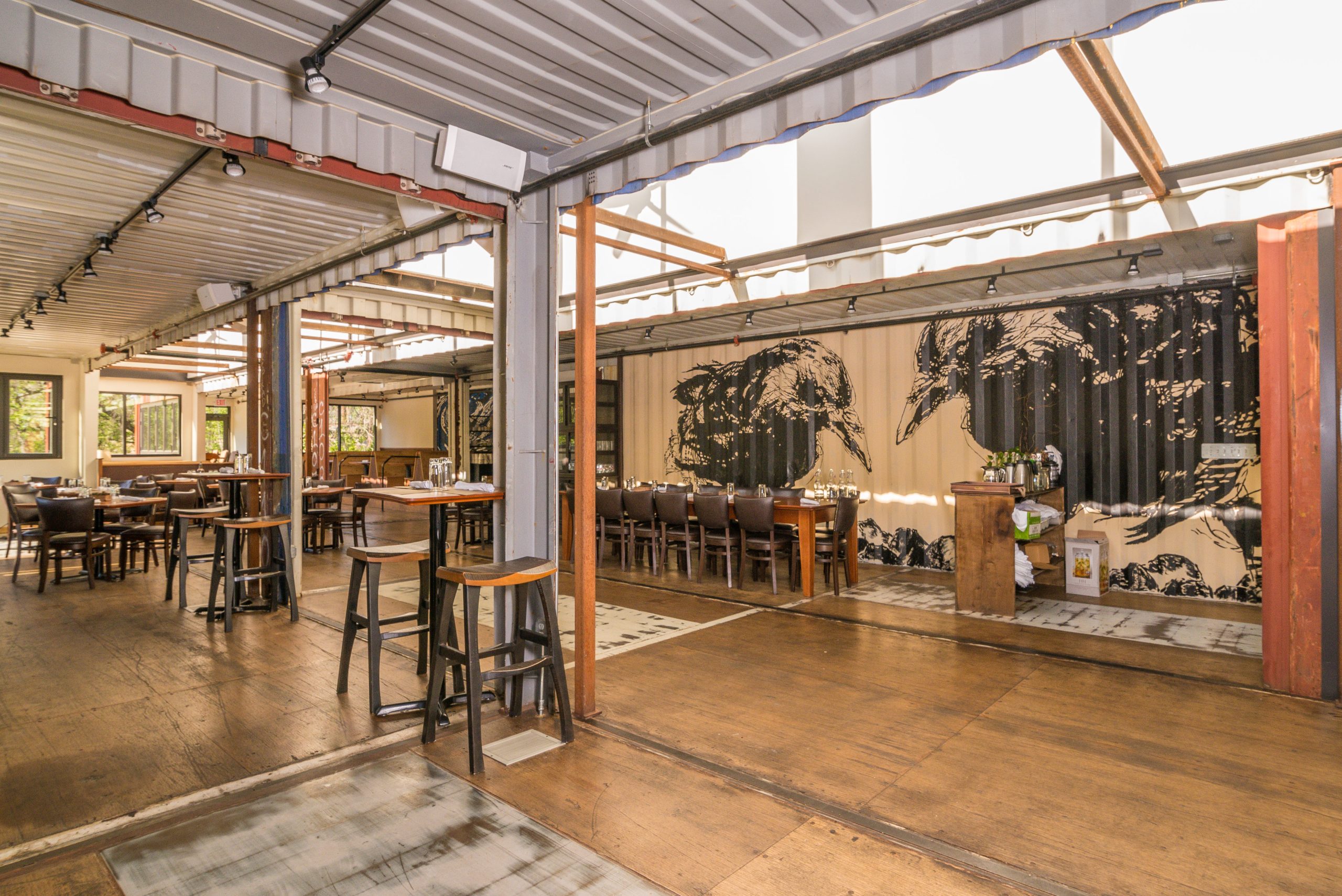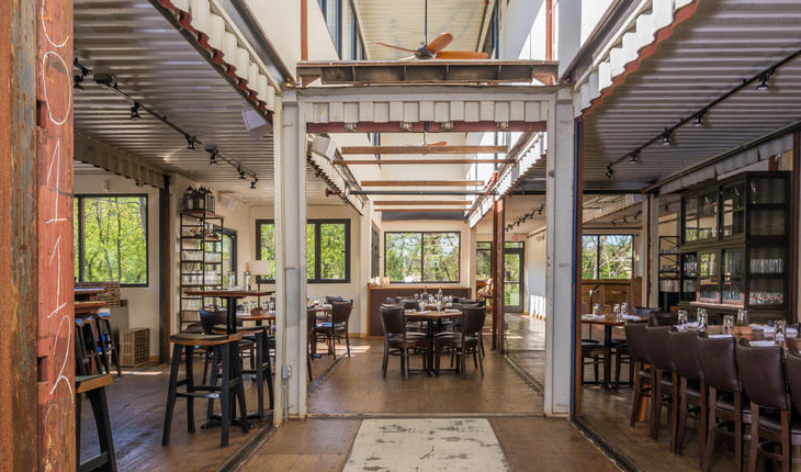 Constructed from reclaimed shipping containers, the structure is a testament to the power of upcycled materials in commercial architecture. The containers were carefully arranged and modified to create a dynamic layout that includes both indoor and outdoor dining areas, a full commercial kitchen, private event spaces, and shaded decks—all while maintaining a strong connection to the landscape. This modular construction method not only reduced waste but also accelerated the building timeline and minimized site disturbance.