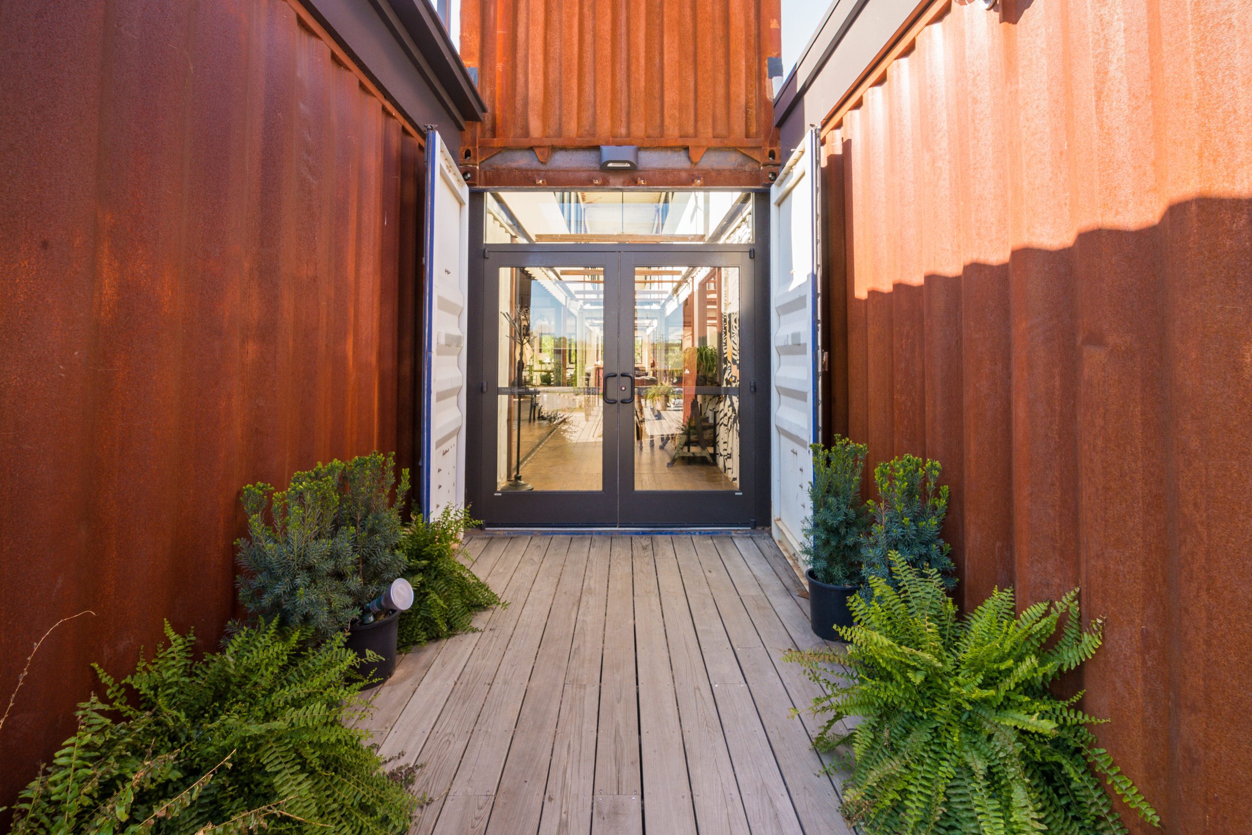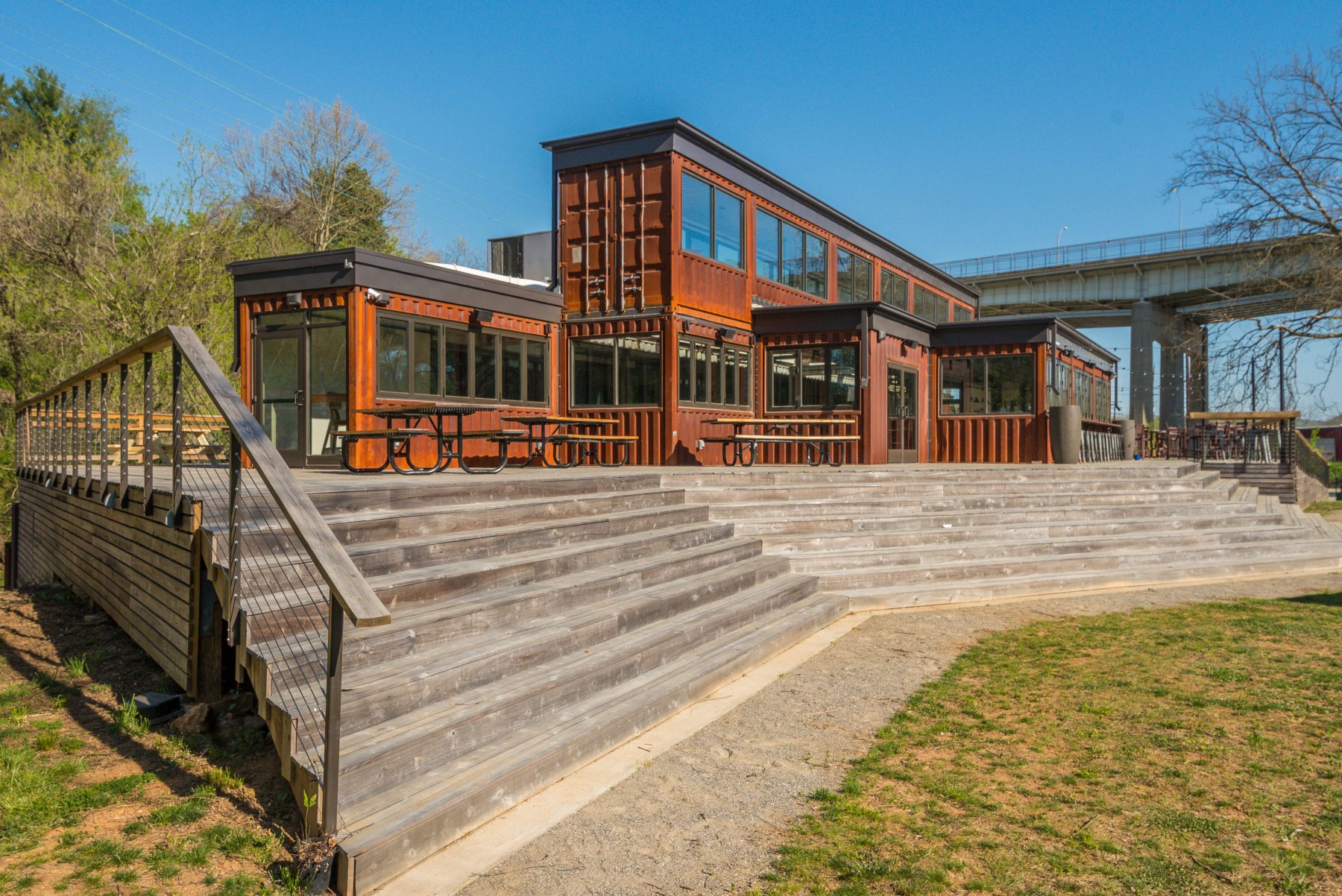 Constructed from reclaimed shipping containers, the structure is a testament to the power of upcycled materials in commercial architecture. The containers were carefully arranged and modified to create a dynamic layout that includes both indoor and outdoor dining areas, a full commercial kitchen, private event spaces, and shaded decks—all while maintaining a strong connection to the landscape. This modular construction method not only reduced waste but also accelerated the building timeline and minimized site disturbance.